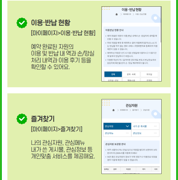 예약 완료된 자원의 이용 및 반납 내역과 손/망실 처리 내역과 이용 후기 등을 확인할 수 있어요.