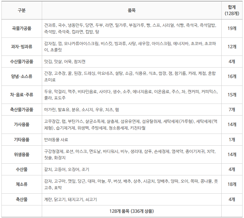 · 곡물가공품(19개), 과자·빙과류(12개), 가사용품(14개), 차·음료·주류(15개), 채소류(18개) 등 총 128개